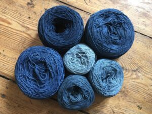 - Blue shades cotton threadsThese are cotton threads I dyed this year at the Farbehutte. How nice to see such a variation of blue!
