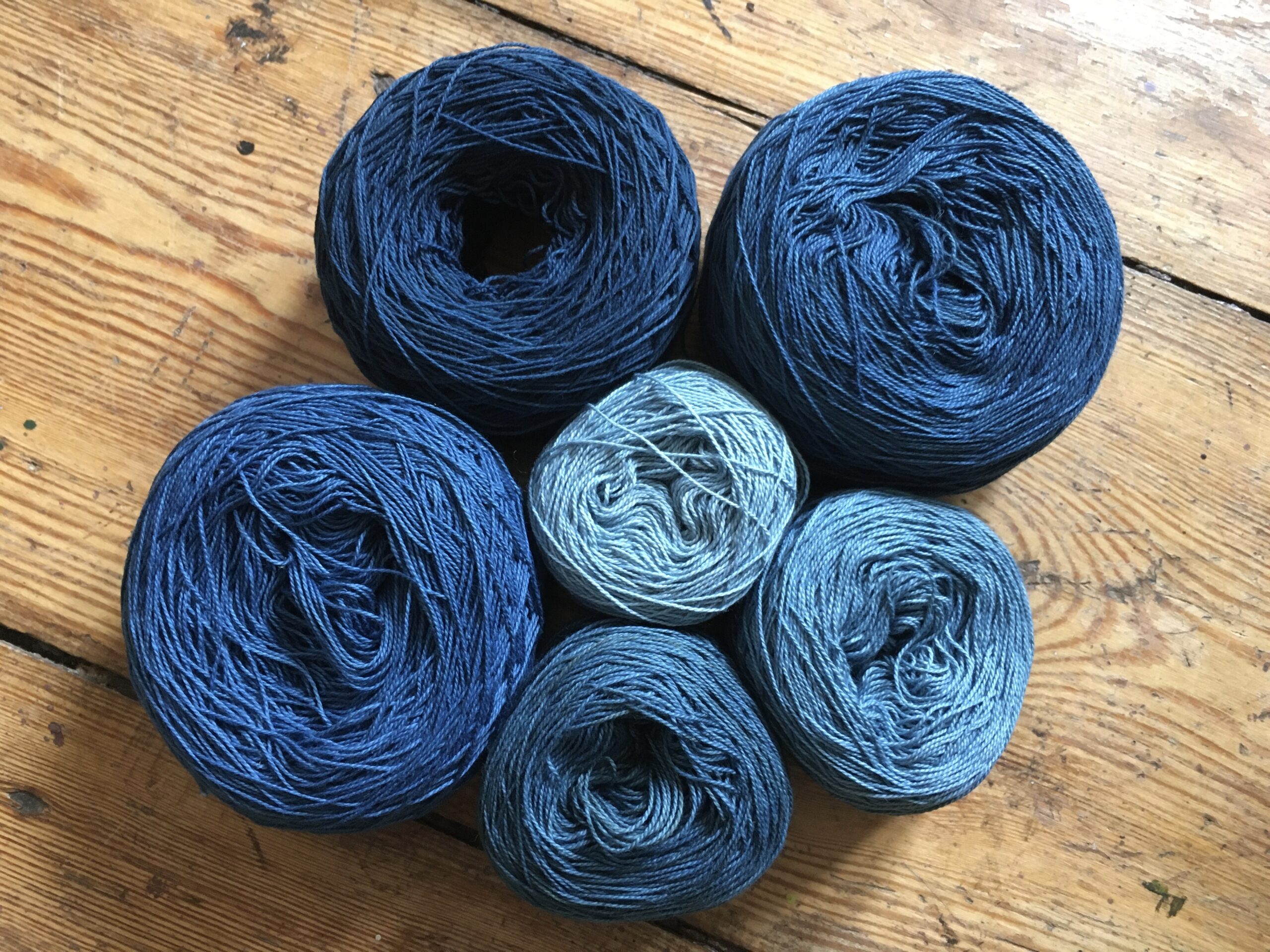 These are cotton threads I dyed this year at the Farbehutte. How nice to see such a variation of blue!