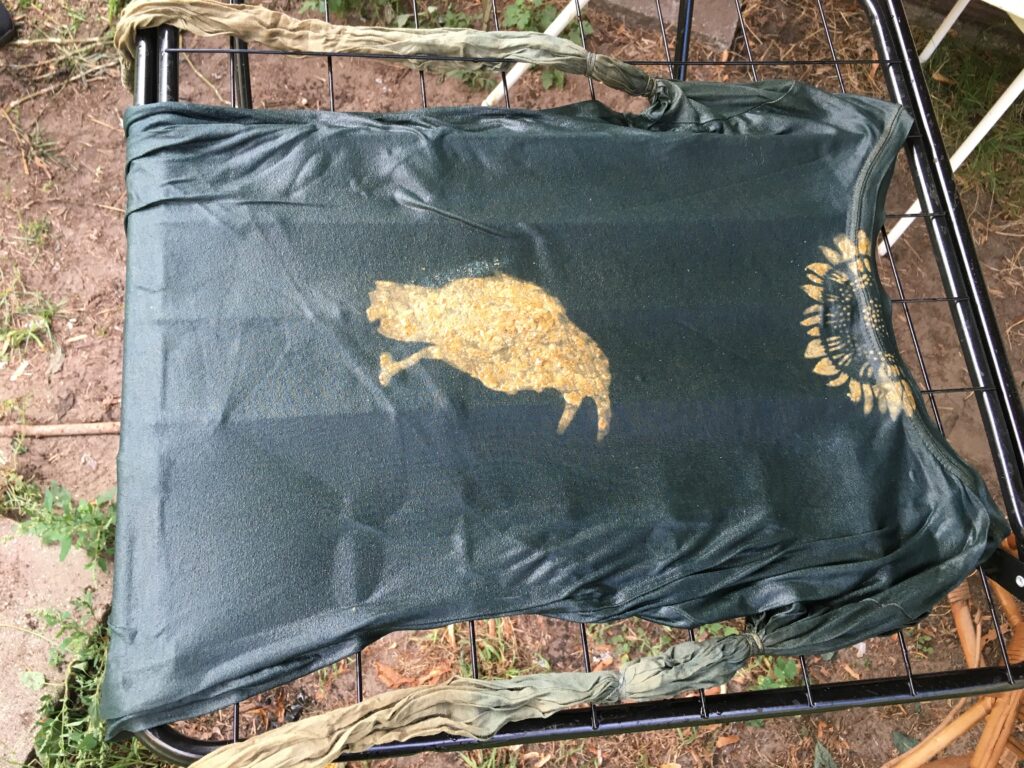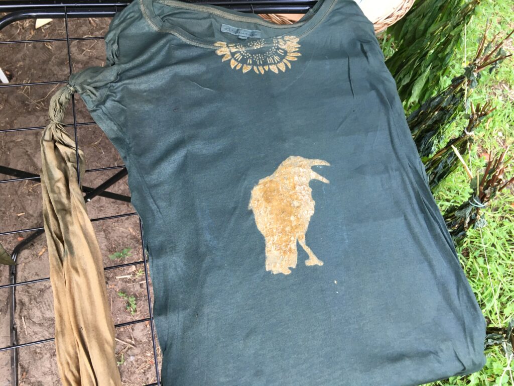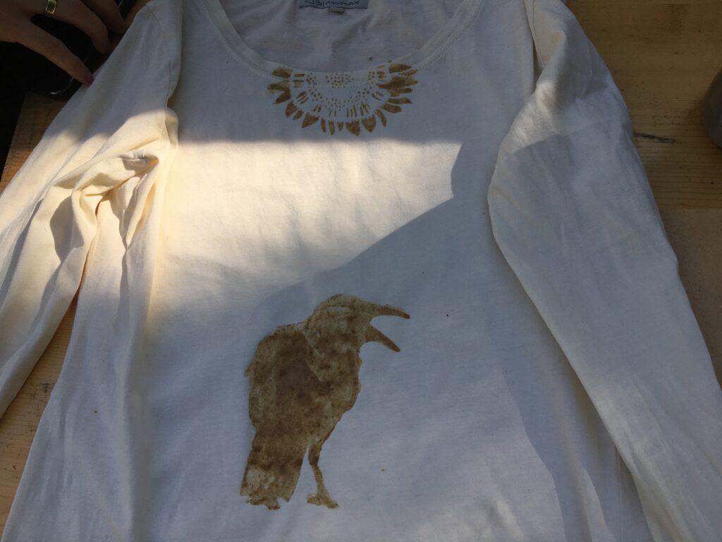 In the mean time, Alina brought her natural color cotton t-shirts, that is washed and prepared well. she printed crow and sun flower motif on the day1, let it dry over night and dyed on the second day. It was a bit tricky to dye as the vat is not deep enough to dip the t-shirt on vertical way (it will touch the bottom sukumo otherwise). With two people, we manage to hold the t-shirt on horizontal way in the vat so it submerges completely and the motif part stays straight without folding to itself. We left the sleeves out as it was too much to handle… Our intention was then to dye only sleeves later. Each dip was 3min long, and we left at least 5min outside for oxidation. At the end, she managed 6 times of dip and it became really nice deep blue. Sleeve was dipped 1 time at the end. The uneven gradation effect on the sleeve came out also very nice.