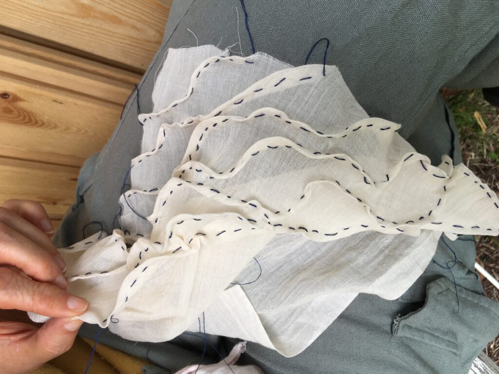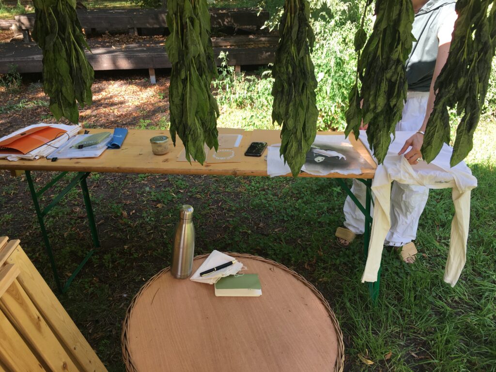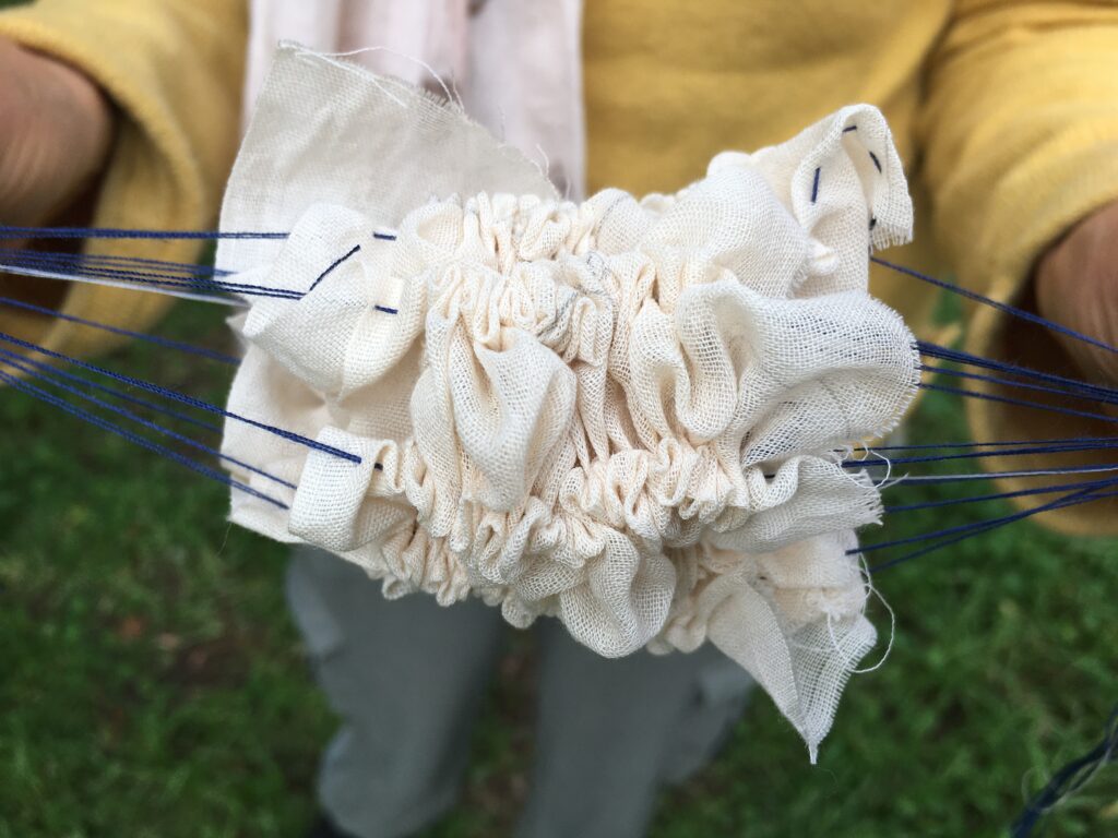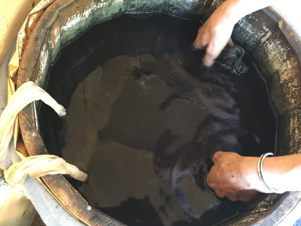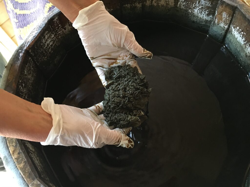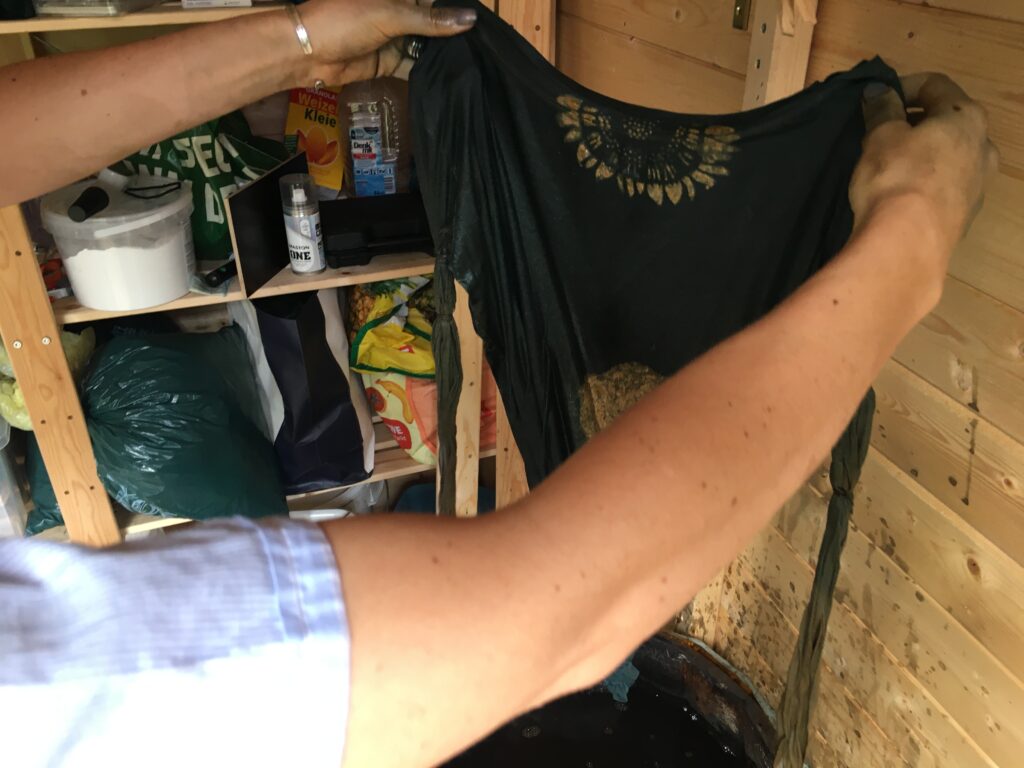 Maria tried Shibori technique she found on the book we have at the Färbehutte. She made a very nice stitch work, then it was pulled to make the “shibori” or squeeze effect then dyed 3-4 times in the vat. As the vat was already getting tired by then, it did not dye very deep. So we decided to keep the shibori without opening in a water bucket, so she can continue dying in the next week. I am curious how this shibori will come out.