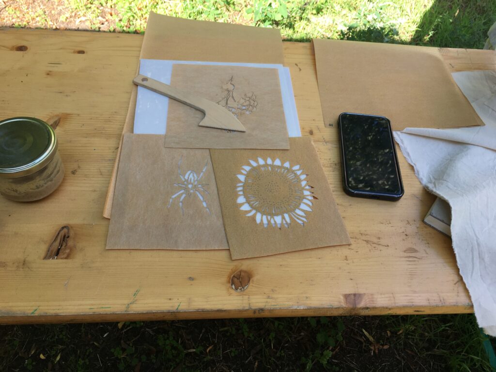 This was one of the last nice still warm and sunny weekend and we had a katazome experiment session with a small group. As we are still trying to find out what is the good way to work with katazome here, it is not a workshop, but rather to try find out a good balance with how to apply katanori/rice resist paste, how to dip fabric in vat and how long to keep it and how long to oxidize it.