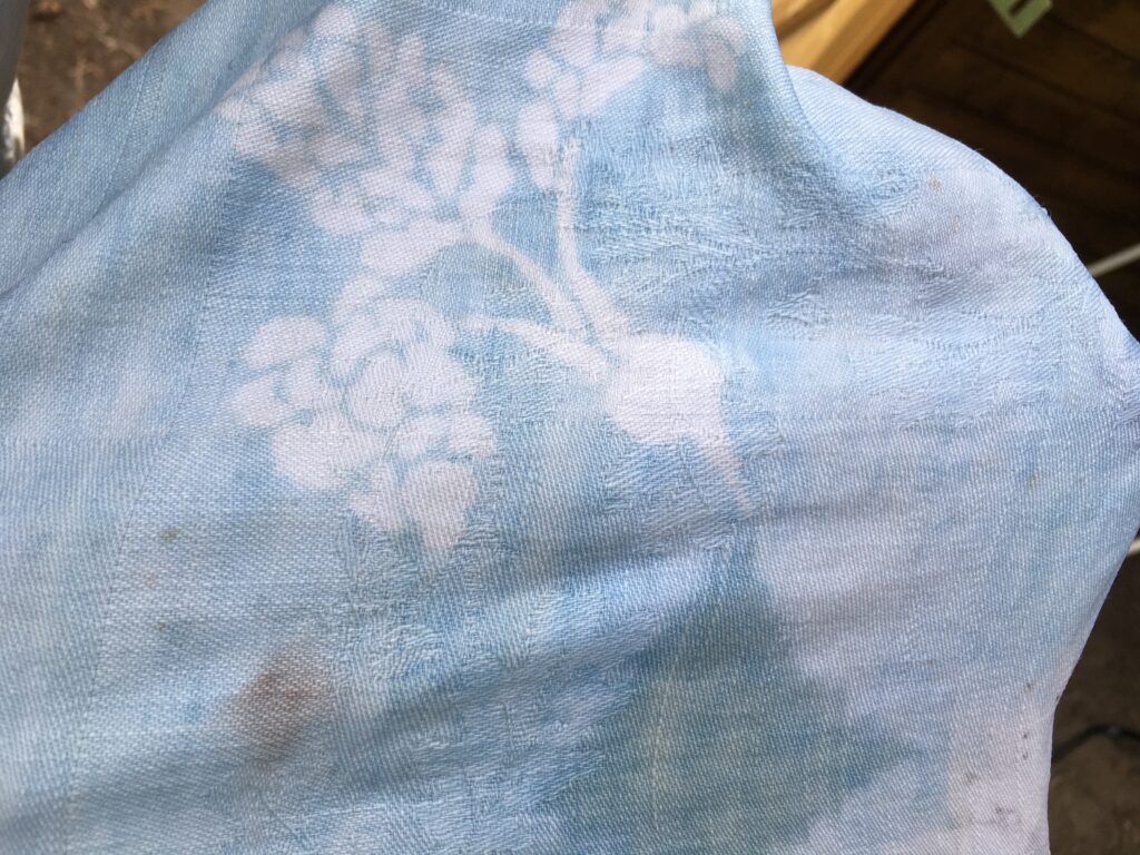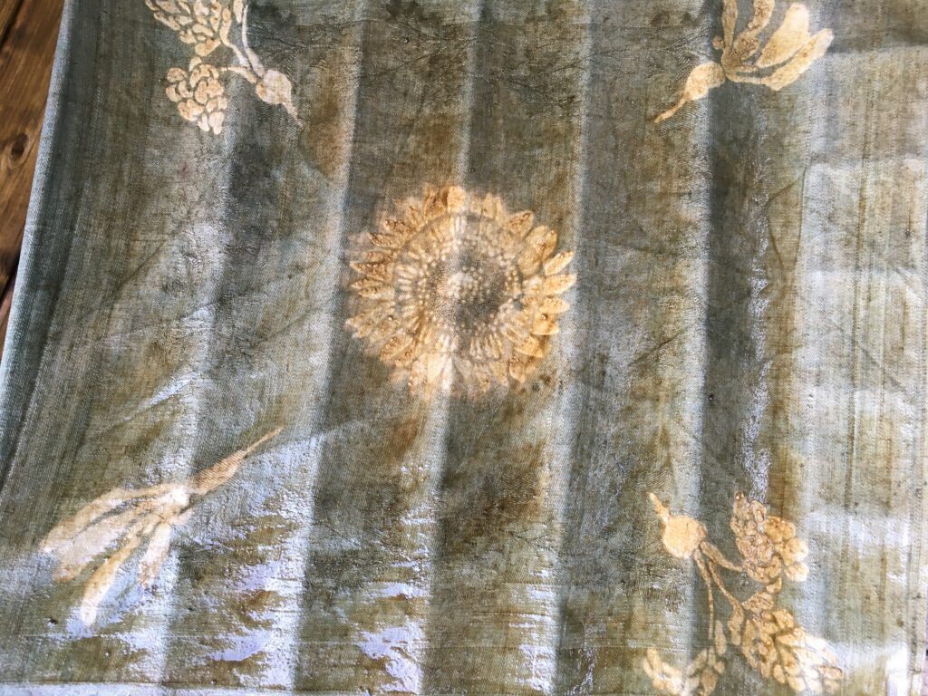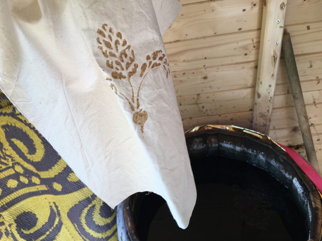 Sarah tried a nice pattern with red beet and radish with a sunflower in a middle. This was printed on an old cotton napkin. As she wanted to dye on the same day, we used hair dryer to dry the resist paste. Then Sarah had an idea to print sunflower on the back side, at the exact same place so it stays very white… but she had an accident on this second print and it got messed up. She washed it off from the back and dried the fabric… but as she dyed the fabric, the messed up resist on the back was visible. It is still resisting the dye to go in and the middle looked very white. At the end, she decided to not to dip many times and washed it off, so the motif stayed very light blue and white. Maybe we could dye this again to achieve blue/light blue print, or to try printing paste exactly at the same spot… we need to do more experiments.