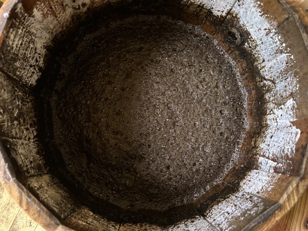 When we were making the 1st Vat, we were also cooking the ash water on the side, and the ash water added to the Sukumo for the first time (the first 5L) was quite hot, maybe over 50 degrees. We were excited enough people, so we also mix/kneed it very well at this point and left it for 1-2h in this sticky gue state.