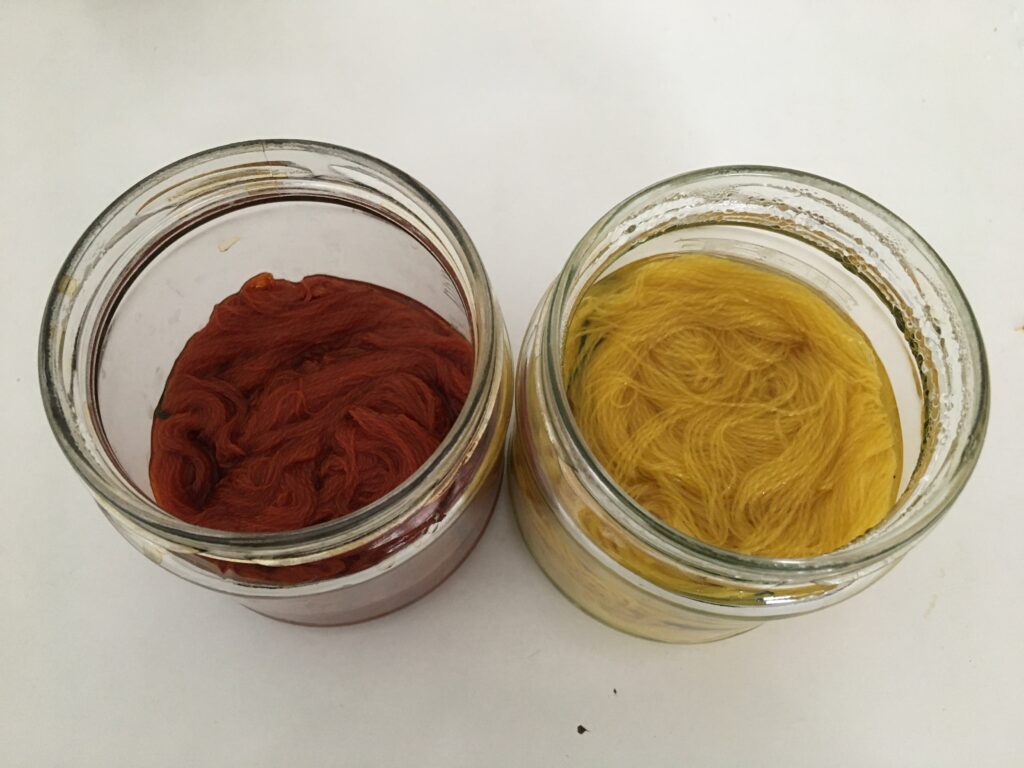 This time, I mordant wool yarns with Aluminumtriformate (cold mordant) overnight then dyed with dyers camomile (yellow) and dyers cosmos (orange). I used 4g of cosmos with 20g of wool yarn, 3g of camomile with 20g of wool yarn (bottom left photo result). The Left bottom photo try-out was with left over dye liquid from the first one with extra 3g cosmos and camomile each. The orange is more yellow-orange as it had a bit of camomile in it as well. The thin yarn came out light yellow, as the thick one went into the dye bath first and probably took out most of the yellow before the thin yarn was introduced to the bath.