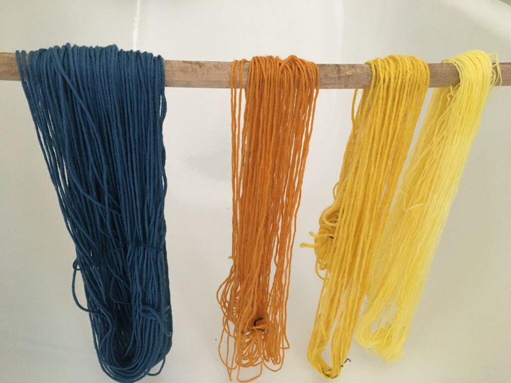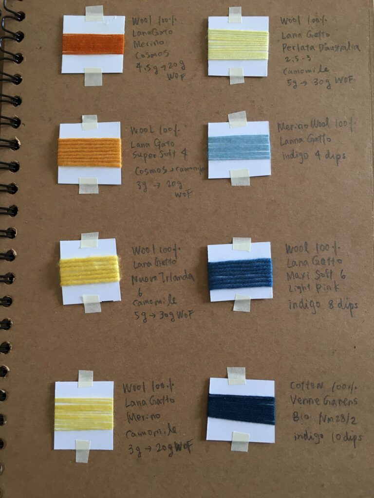 I hang them next to the indigo dye tryouts to dry… and I realize it is a quite nice color palette. This could be a nice knitted scarf. A nice idea for the winter creation!